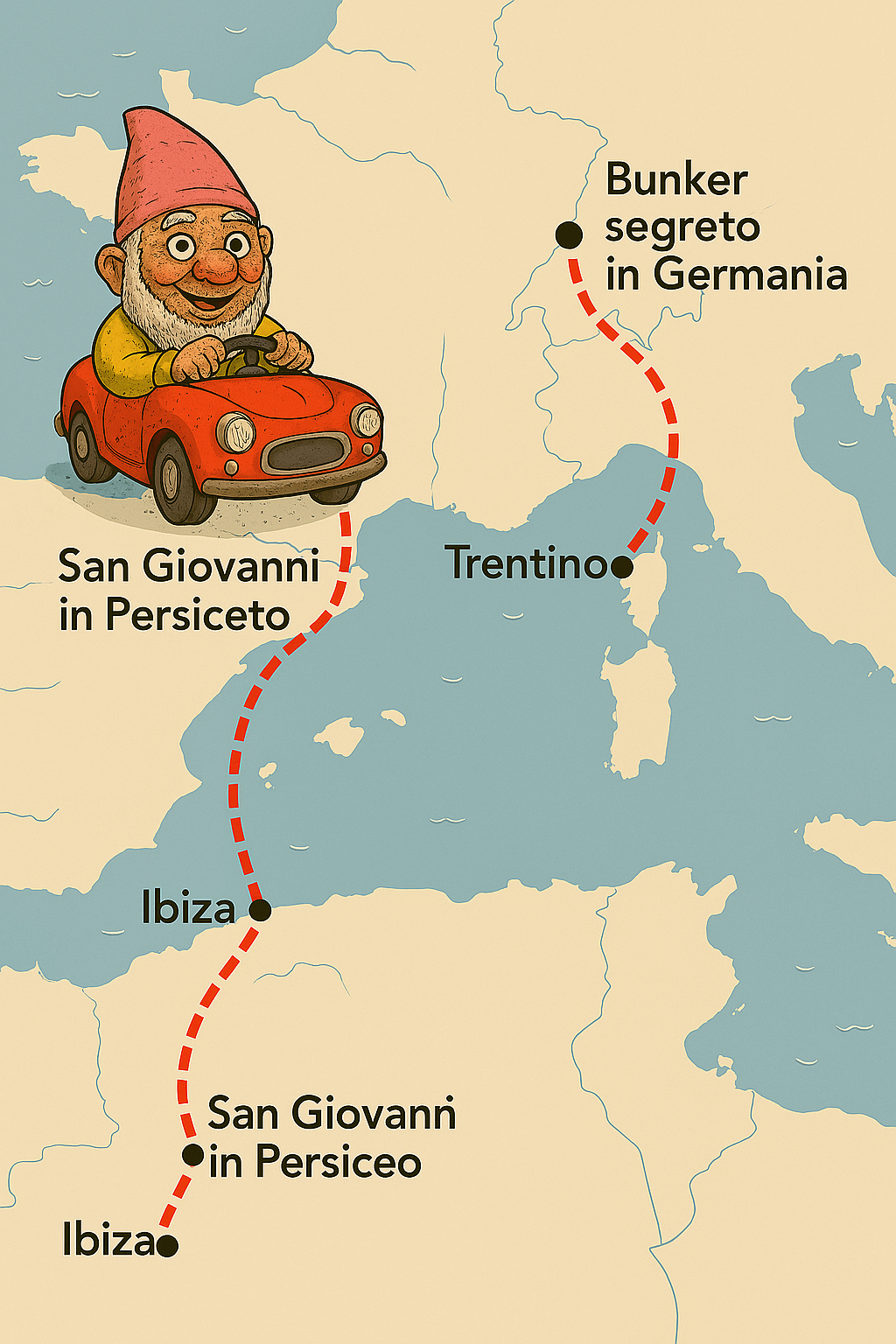 Ecco la mappa della fuga gnomesca con il protagonista alla guida della sua leggendaria automobile! 🚗🧙♂️ Linee tratteggiate, curve improbabili e tappe fuori di testa tracciano il percorso epico da San Giovanni in Persiceto fino al bunker segreto in Germania.