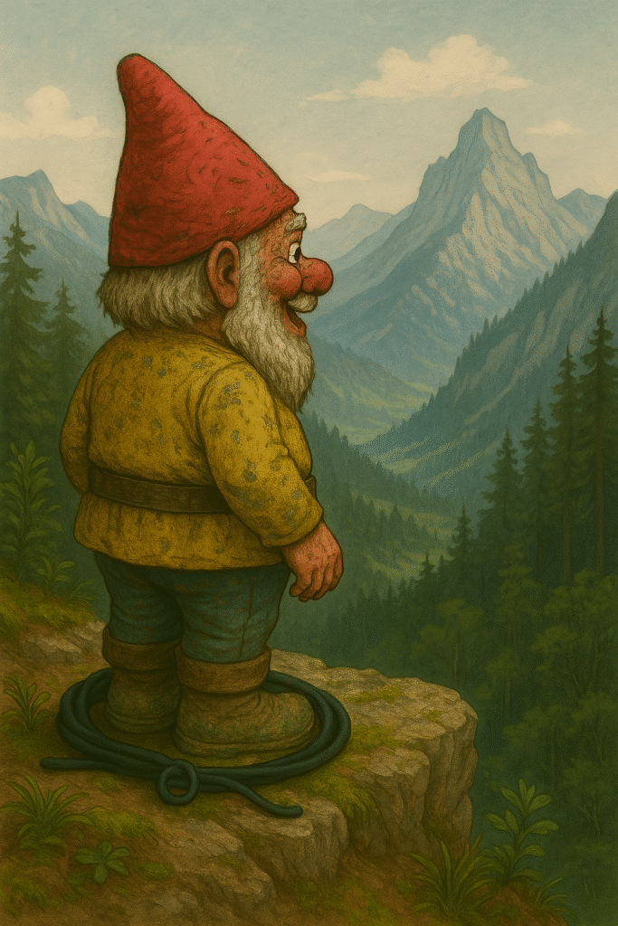 Sta per arrivare un momento di pura contemplazione gnomesca. 🌄🧙♂️ Il nostro eroe si trova sul bordo di una montagna, con lo sguardo perso all’orizzonte tra vette maestose e cieli infiniti… una pausa silenziosa nel mezzo della sua fuga leggendaria. 😌📸